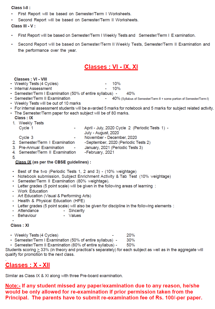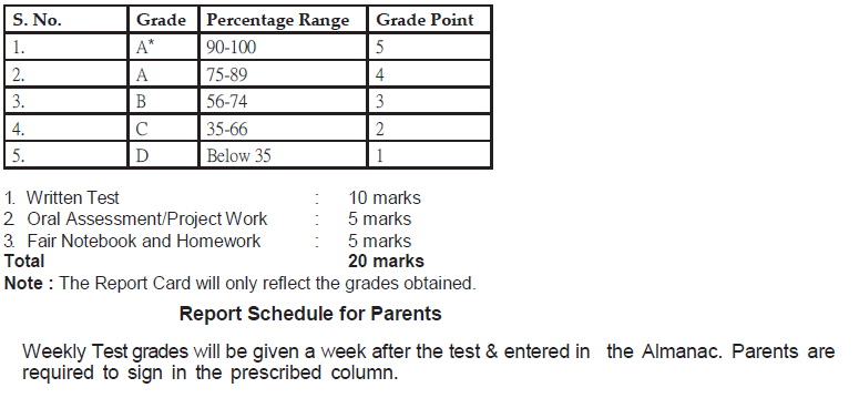 Students of Class I-IV will be assessed on the basis of the Weekly Worksheet Cycles / Weekly Tests. Semester/Term Examination will be held only for class V. Letter grades will be given in all areas of learning.